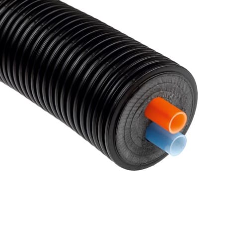 Особо гибкий предварительно изолированный двойной трубопровод, сочетающий оба потока, как подачу, так и возврат, в одной и той же изоляции и защитном кожухе. Эта конструкция в первую очередь предназначена для транспортировки теплоносителя в виде воды или других жидкостей через подземные распределительные сети.